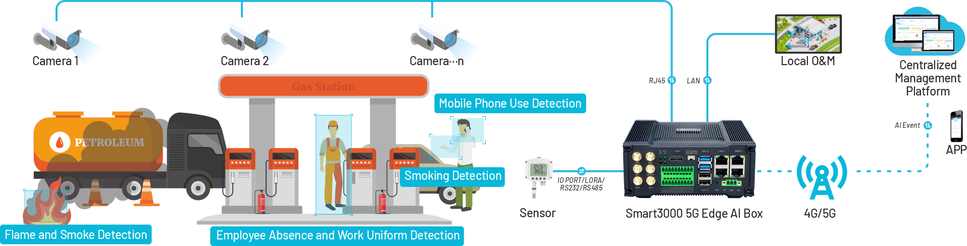With the increasing demand for safety management at gas stations, intelligent technology has become a core component of station operations. The Hongdian Intelligent Safety Gas Station Management Solution integrates artificial intelligence, video analytics, sensor technology, and edge computing, utilizing the Smart 3000 Edge AI BOX as the central hardware to provide comprehensive safety monitoring and risk management. Through real-time data collection and intelligent analysis, it can swiftly identify potential safety hazards, prevent accidents, and enhance emergency response efficiency.